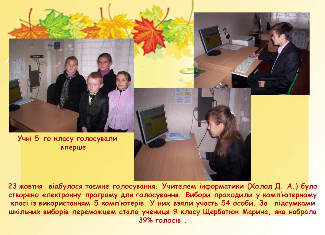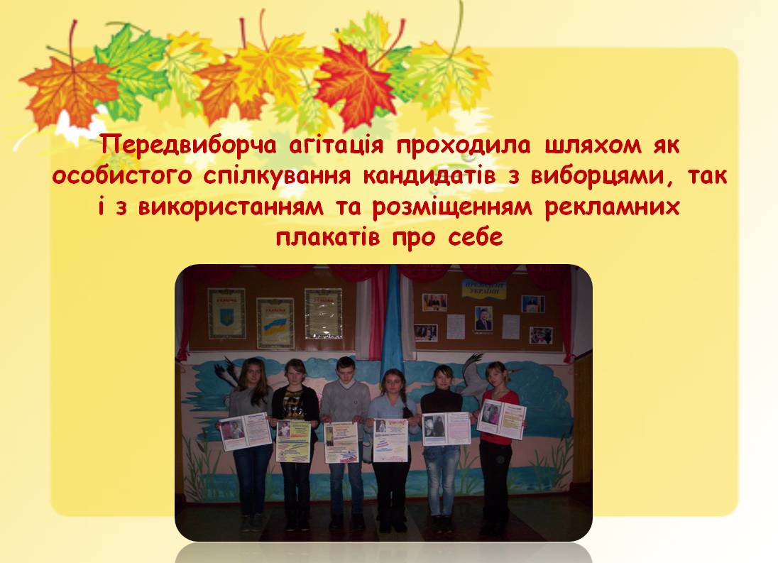 Шановні старшокласники! Цікаво дізнатись, як відбувається передвиборча агітація та вибори активу учнівського самоврядування у Вашому навчальному закладі. Найважливіші фото з коментарями до них можете розмістити в цій папці.