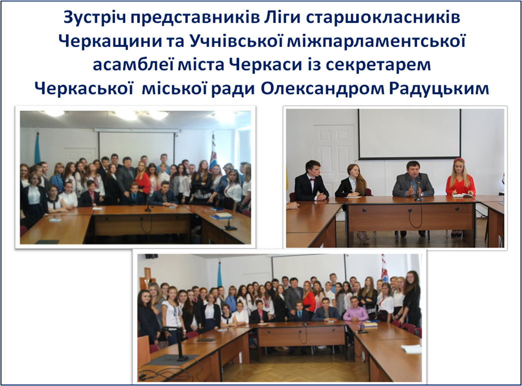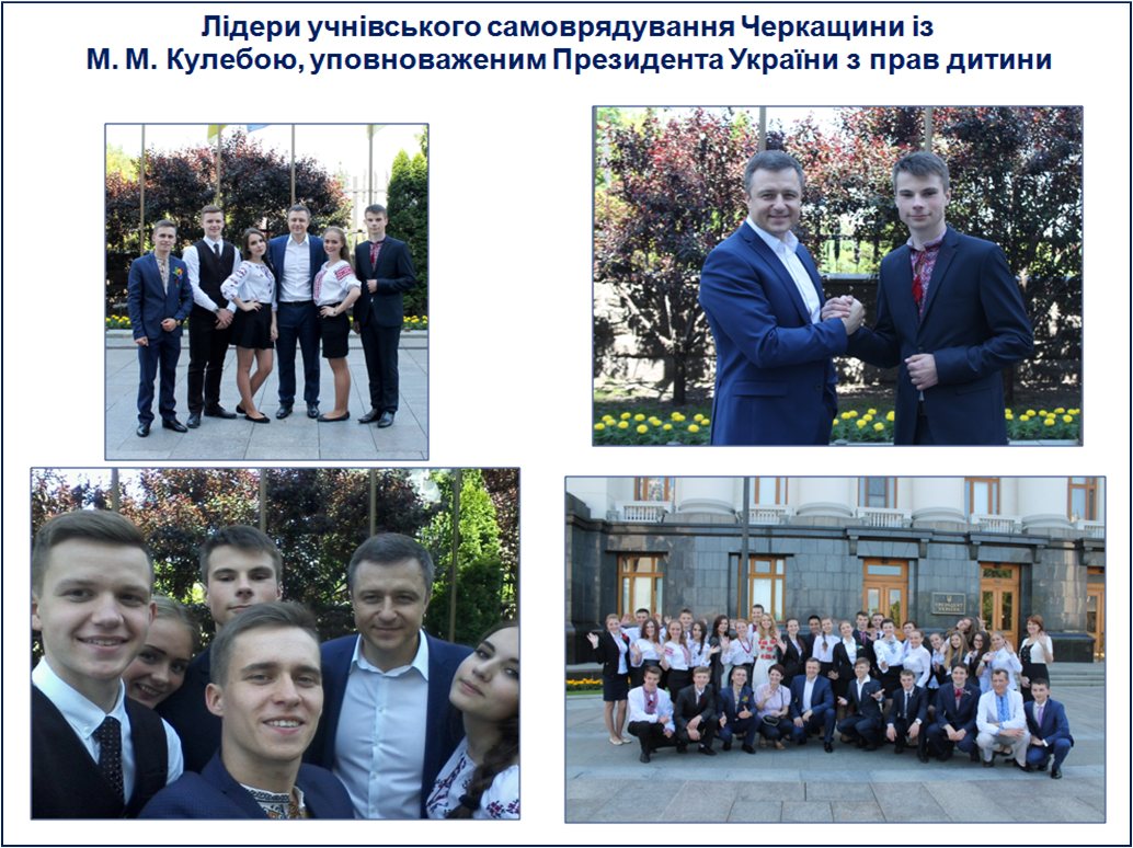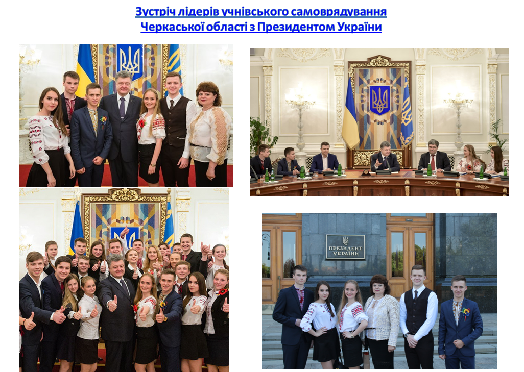 З нагоди святкування Дня захисту дітей у Адміністрації Президента України відбулась зустріч лідерів учнівського самоврядування з Президентом України Петром Олексійовичем Порошенко. На цій зустрічі Черкащину представляли: Аліна Краснопеєва, спікер Учнівської Міжпарламентської Асамблеї м.Черкаси, Ві...